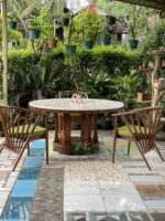 Meja makan ini memiliki desain klasik dengan bentuk bulat yang elegan, dilengkapi dengan 4 kursi bergaya jari-jari pada sandarannya. Terbuat dari kayu jati berkualitas tinggi, meja dan kursi ini kokoh, tahan lama, dan memiliki tampilan natural yang menawan. Finishing halus dengan warna natural atau coklat tua semakin menambah kesan mewah dan elegan pada ruang makan Anda.